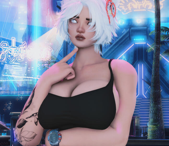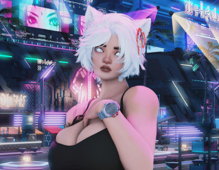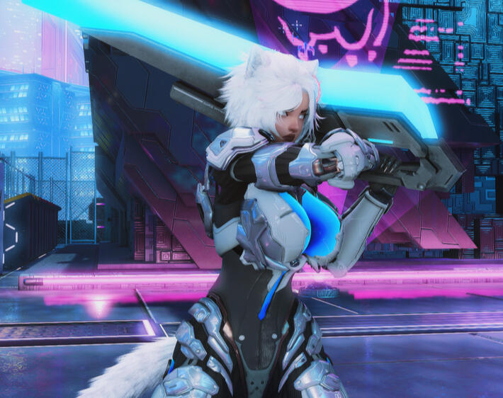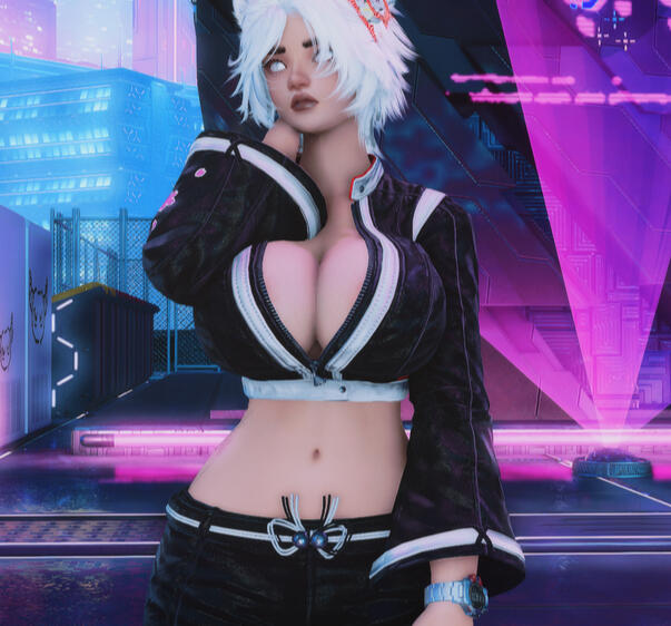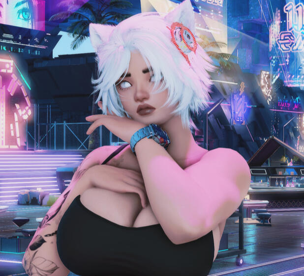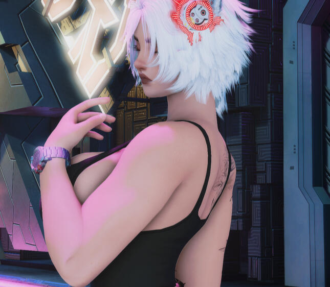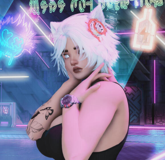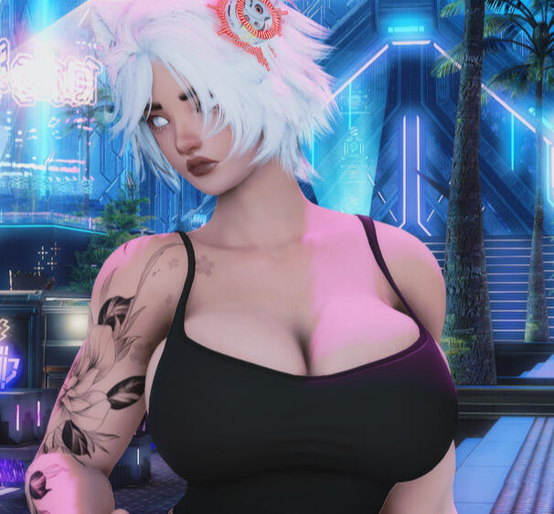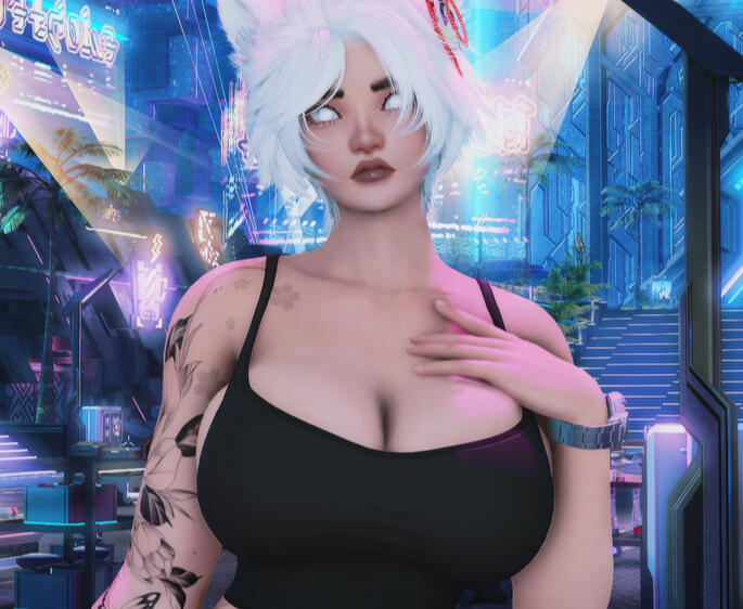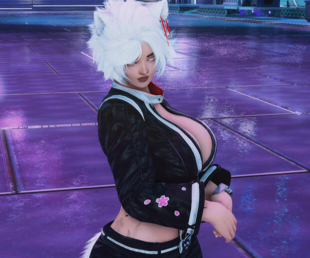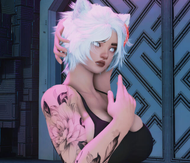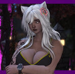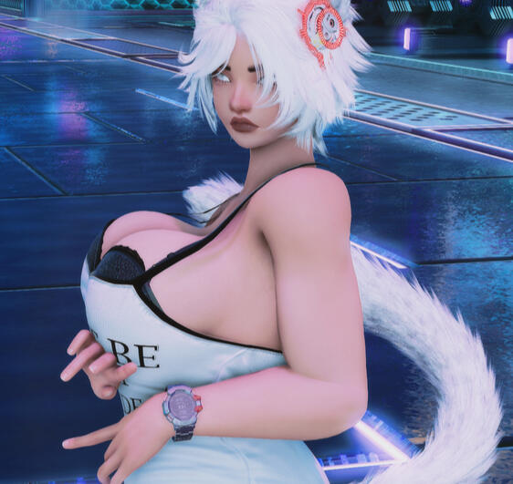 This Miqo'te sports an assorted array of hair styles, usually White(though sometimes dye'd various colours) and sometimes sporting highlights. She is fair skinned, short and rather Curvy. Depending on the job she is working at the time, her outfit will vary. She is often seen relaxing in a armored revealing white and black one peice of custom armor she got from Solution 9.